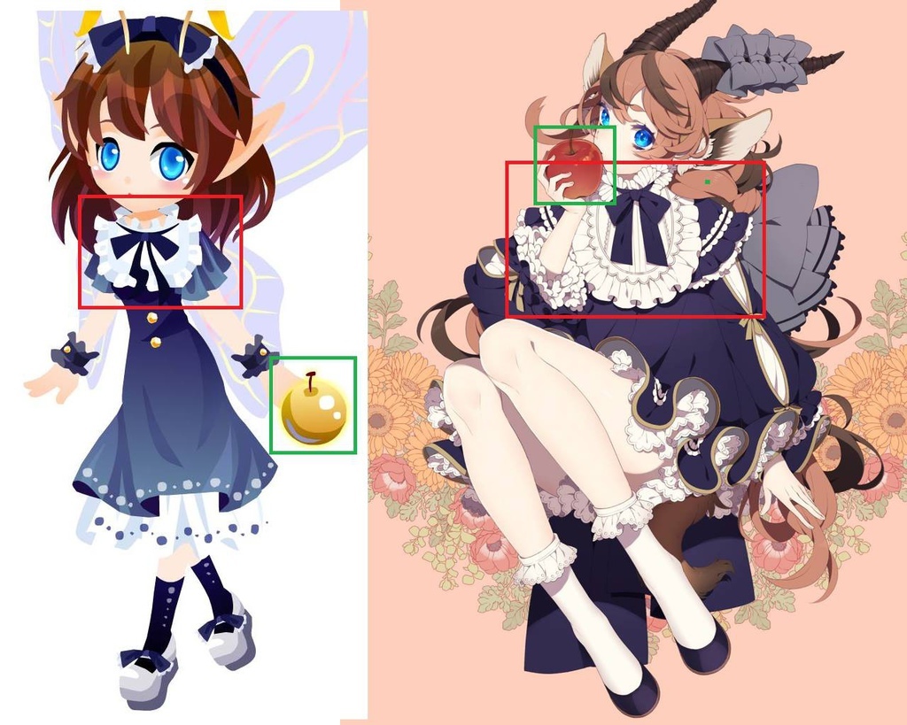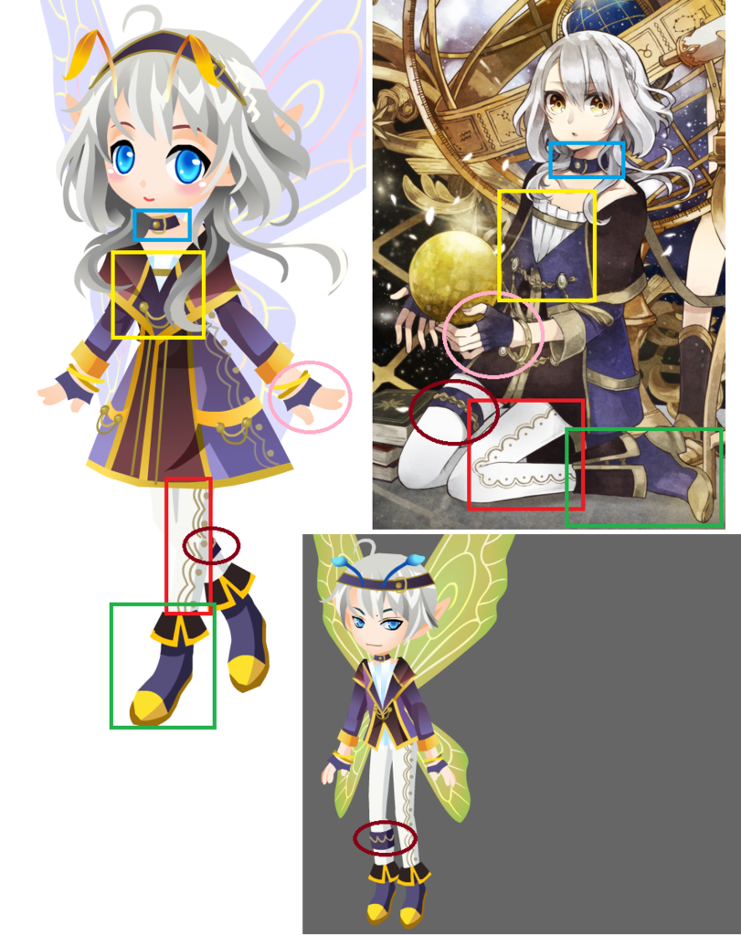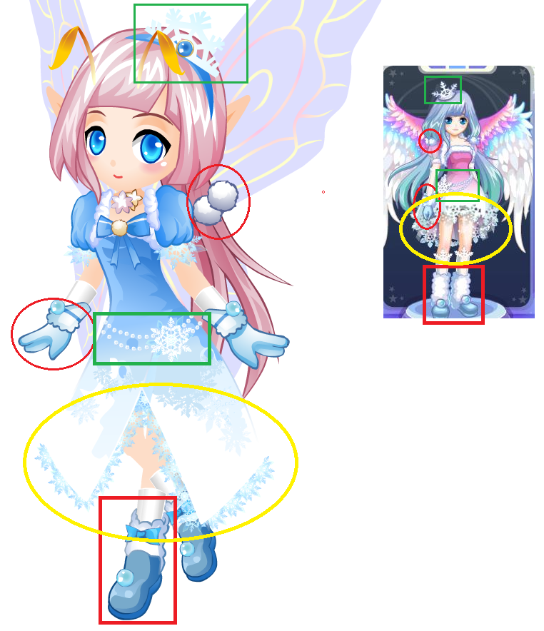 <對比圖> 紅框為幾乎一樣的部份,雪球髮飾、手套、鞋襪 綠框為擦邊部份,雪結晶頭飾、有2條珠鍊的雪結晶腰帶 黃框為擦邊部份,衣擺的邊緣皆使用雪結晶花樣 綜上所述,同一張圖有這麼多不可能相似的地方雷同了,判斷應屬抄襲!