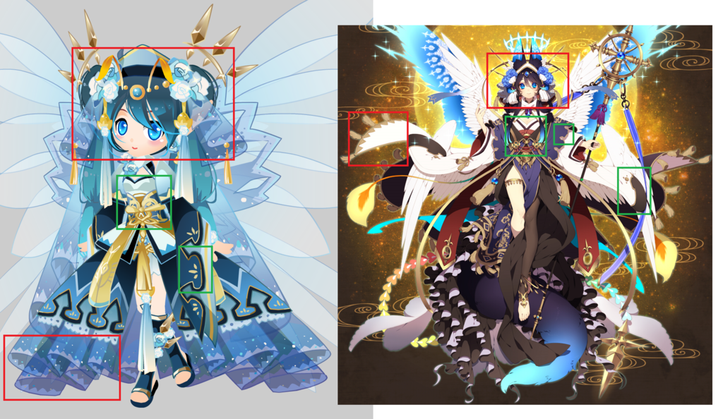 <對比圖> 整個頭部裝飾幾乎對的上,和服振袖圖案、裙尾圖案、腰部設計很相似!(圖小點圖放大)