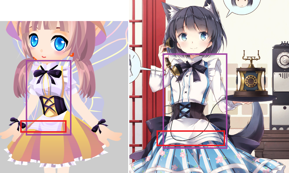 2015.10月-童年回憶套裝(高清圖)  <對比圖>領口、黑領結、膨膨肩袖、2條吊帶、襯衫中線花樣、高腰雙交叉綁帶、白色方圍裙,重點在圍裙上都有那2條花邊,小細節完全相同。